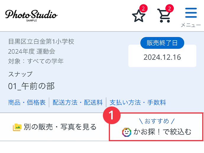 「かお探!」を使用すると、マイアカウントに登録した顔写真や買物かご・注文履歴の写真をもとに販売写真の絞込みができます。